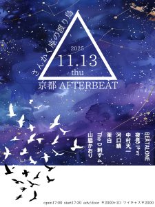 « すべてのイベント さんかく座の渡り鳥 11月13日 « LIVEセッション① SPARKING!! Vol.4 » act: BEATALONE 夜見ニャミ 中村天一 河口績 茉白 The D刺す4 山脇かおり OPEN 17:00 START 17:30 大人¥2500 大学生¥2000 高校生以下¥1000 (各1D込) 小学生以下¥500(1Dのみ) ツイキャス ¥2000 international visitor ¥500 Passport presentation + Google カレンダー+ iCal エクスポート 詳細 日付: 11月13日 イベントカテゴリー: ライブ