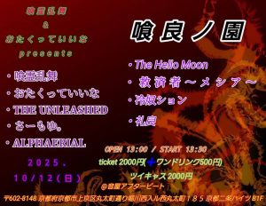 « すべてのイベント このイベントは終了しました。 喰霊乱舞&おたくっていいな pre. 喰良ノ園 10月12日 « THE UNLEASHED pre. SEISHIN SAGA Vol.5 ホールレンタル » act: 喰霊乱舞 おたくっていいな THE UNLEASHED さーもゆ。 ALPHAERIAL The Hello Moon 救済者~メシア~ 冷奴ション 札良 OPEN 13:00 START 13:30 ADV/DOOR 2000(+1drink) ツイキャス 2000 + Google カレンダー+ iCal エクスポート 詳細 日付: 10月12日 イベントカテゴリー: ライブ