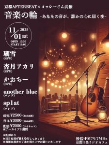 « すべてのイベント このイベントは終了しました。 音楽の輪 ~あなたの音が、誰かの心に届く夜~ 11月1日 « ホールレンタル Gold Vibes » act: 瑚雪 sp1at 杏月アカリ unother blue かおちー OPEN 17:30 START 18:00 ADV 2500 / DOOR 3000(+1drink) ツイキャス2000 + Google カレンダー+ iCal エクスポート 詳細 日付: 11月1日 イベントカテゴリー: ライブ