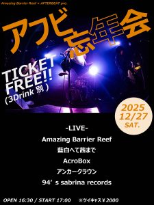 « すべてのイベント このイベントは終了しました。 アフビ忘年会 2025年12月27日 « ホールレンタル めっちゃおもろいやん!! Vol.196 » act: Amazing Barrier Reef 藍白へて茜まで AcroBox アンカークラウン 94`s sabrina records OPEN 16:30 START 17:00 ADV/DOOR FREE(+3drink) + Google カレンダー+ iCal エクスポート 詳細 日付: 2025年12月27日 イベントカテゴリー: ライブ