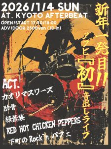 « すべてのイベント 新年一発目!アフビ『初』音出しライブ 1月4日 « 毎年恒例!!アフビでカウントダウン OPENmic » act: カオリマスワーズ 肋骨 緑葉族 RED HOT CHICKEN PEPPERS 下町のRock`n パフェ OPEN 17:30 START 18:00 ADV/DOOR 2500(1drink in) + Google カレンダー+ iCal エクスポート 詳細 日付: 1月4日 イベントカテゴリー: ライブ