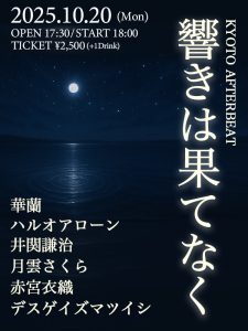 « すべてのイベント 10月20日 « ホールレンタル OPENmic » act: 華蘭 ハルオアローン 井関謙治 月雲さくら 赤宮衣織 デスゲイズマツイシ OPEN 17:30 START 18:00 ADV/DOOR 2500(+1drink) + Google カレンダー+ iCal エクスポート 詳細 日付: 10月20日 イベントカテゴリー: ライブ