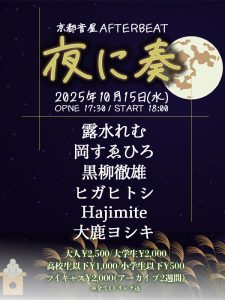 « すべてのイベント このイベントは終了しました。 夜に奏 10月15日 « OPENmic LIVEセッション② » act: 露水れむ 岡すゑひろ 黒柳撤雄 ヒガヒトシ Hajimite 大鹿ヨシキ OPEN 17:30 START 18:00 大人¥2500 大学生¥2000 高校生以下¥1000 (各1D込) 小学生以下¥500(1Dのみ) ツイキャス ¥2000 international visitor ¥500 Passport presentation + Google カレンダー+ iCal エクスポート 詳細 日付: 10月15日 イベントカテゴリー: ライブ